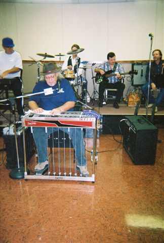 The steel guitar has a split front on it with a black lightning bolt down the middle with mother of pearl inlay around the bolt.Other parts of the front are red. |