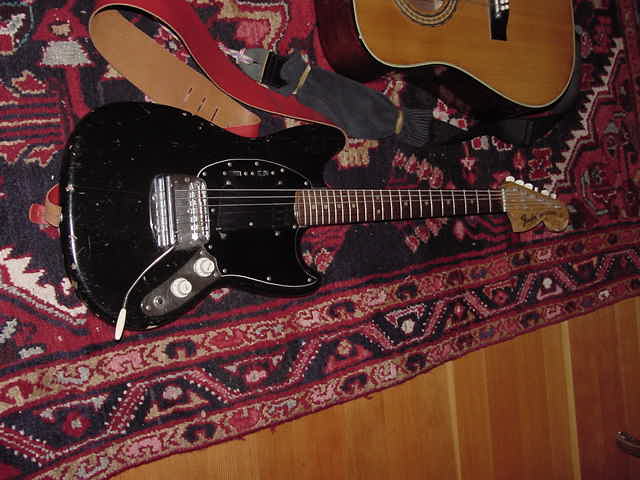 Fender Mustang - Black paint with Black pick guard, white stratocaster type volume and tone knobs (distinctive -not standard on mustang guitar), Circa 1972 Serial# 539183 Has a lot of wear and tear, dings, scratches etc, especially on the top back. The headstock has some water damage and has 3 screw holes near the nut (also distinctive). The guitar had a red 2-3 inch wide leather strap at the time it was stolen. Tremolo arm is missing although it is set up properly for tremolo. High E string is wound 180+360 degrees around the tail piece (to the outside of the string end so that the string didnt slip off bridge saddle. I have owned this guitar since 1984. Dimarzio Pots (split post, not solid like stock fender pots) |